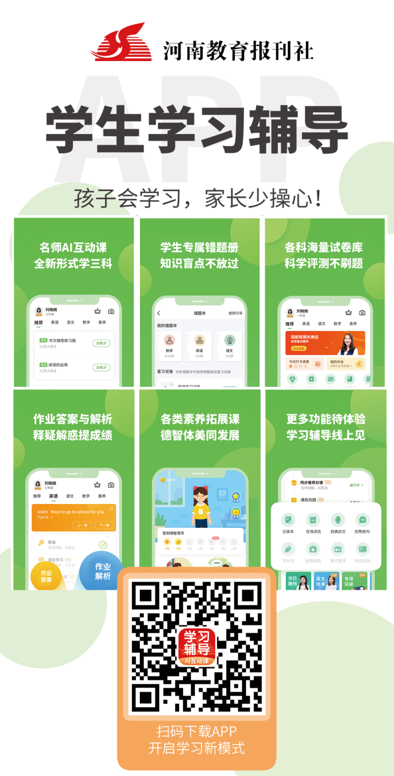 “學(xué)生學(xué)習(xí)輔導(dǎo)”是河南教育報刊社新打造的一款數(shù)字媒體產(chǎn)品。以線上資源平臺(APP)形式呈現(xiàn)小學(xué)一至六年級、初中七至九年級課內(nèi)同步及課外配套學(xué)習(xí)資源。包括萬余節(jié)名師同步AI互動課,各版本教材重難點知識講解,點讀、聽寫、錯題本等學(xué)習(xí)工具,勞動與社會實踐、體音美素養(yǎng)、科學(xué)常識拓展課程等。各年級各科內(nèi)容和功能對訂戶全部開放。“學(xué)生學(xué)習(xí)輔導(dǎo)”已列入河南省教育廳圖工委辦公室、河南教育新聞中心、中國郵政集團有限公司河南省報刊發(fā)行局聯(lián)合推薦目錄(郵發(fā)代號36-1017),可通過郵局直接訂閱。