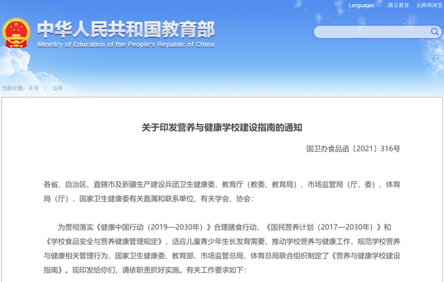 近日,教育部聯(lián)合國家衛(wèi)生健康委等四部門印發(fā)《營養(yǎng)與健康學(xué)校建設(shè)指南》,對適應(yīng)兒童青少年生長發(fā)育需要,推動學(xué)校營養(yǎng)與健康工作,規(guī)范學(xué)校營養(yǎng)與健康相關(guān)管理行為作出要求。
