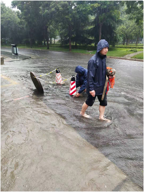 災(zāi)情就是命令,險(xiǎn)情就是戰(zhàn)場。自防汛救災(zāi)工作開展以來,學(xué)校后勤處、保衛(wèi)處、學(xué)工部等相關(guān)部門發(fā)揚(yáng)連續(xù)作戰(zhàn)精神,始終堅(jiān)守在防汛一線,連夜冒雨搶險(xiǎn)、排險(xiǎn),積極進(jìn)行電力搶修、排水、管道疏通等相關(guān)工作,努力做好河水漫灌入校的排放疏通、沙袋封堵防止配電設(shè)施進(jìn)水等防汛救災(zāi)應(yīng)急舉措,加強(qiáng)夜間巡查和人員值守,細(xì)致排查建筑物安全隱患,科學(xué)設(shè)置警示標(biāo)志;雨后及時(shí)組織人員對公共場所打掃、消毒,全力以赴保障全校近3000名在校師生正常生活,截至7月23日,學(xué)校未出現(xiàn)斷水?dāng)嚯姅嗑W(wǎng)情況,超市、餐廳供應(yīng)正常。