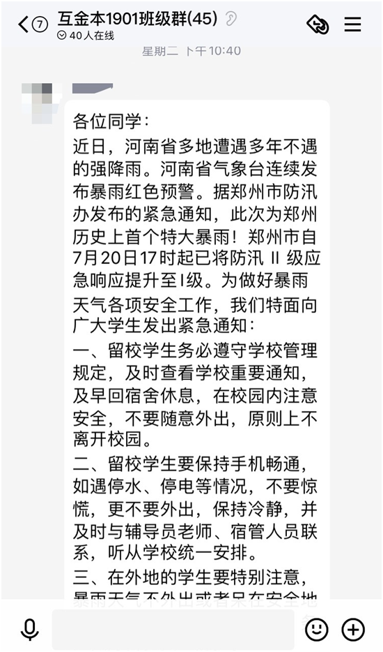 在災(zāi)情發(fā)生的第一時(shí)間,鄭州工商學(xué)院全體輔導(dǎo)員及相關(guān)負(fù)責(zé)老師齊上崗,主動(dòng)摸排,及時(shí)了解掌握受災(zāi)較重地區(qū)學(xué)生的有關(guān)情況,切實(shí)落實(shí)學(xué)校各項(xiàng)資助幫扶政策,幫助學(xué)生和家庭解決實(shí)際困難。對暑期留校的學(xué)生,值班領(lǐng)導(dǎo)多次冒雨到場關(guān)心慰問,各個(gè)學(xué)院的老師、輔導(dǎo)員也紛紛行動(dòng)起來,清理積水、運(yùn)送物資、前來問候關(guān)懷在校同學(xué)們的情況,一聲聲問候,一句句關(guān)心,減輕了同學(xué)們離家萬里的擔(dān)憂。無法到校的老師也主動(dòng)地全面掌握學(xué)生地位置信息,了解實(shí)際情況和所需,為他們提供力所能及的幫助。