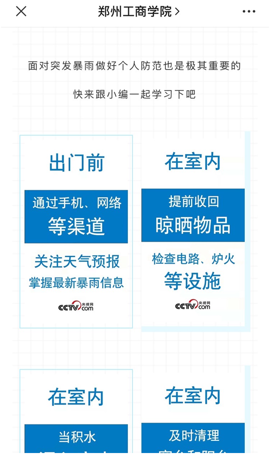 在暴雨來襲,汛情緊急的時(shí)刻,學(xué)校所有官方平臺(tái)在線發(fā)聲,向社會(huì)外界傳遞校園汛情信息和師生安全保障情況;向在外的鄭工商學(xué)子們傳遞避險(xiǎn)的方法、求救救助的方式;向留校的學(xué)生們傳遞領(lǐng)導(dǎo)的關(guān)心、后勤安保的聯(lián)系方式,安撫了他們焦慮的心情,讓家長放心。同時(shí),在所有平臺(tái)準(zhǔn)時(shí)傳遞氣象信息,提醒工商學(xué)子做好防護(hù);積極發(fā)布求助私信、救援電話,與救援力量對接;主動(dòng)承接網(wǎng)上救援工作,幫助受災(zāi)群眾及時(shí)得到支援。