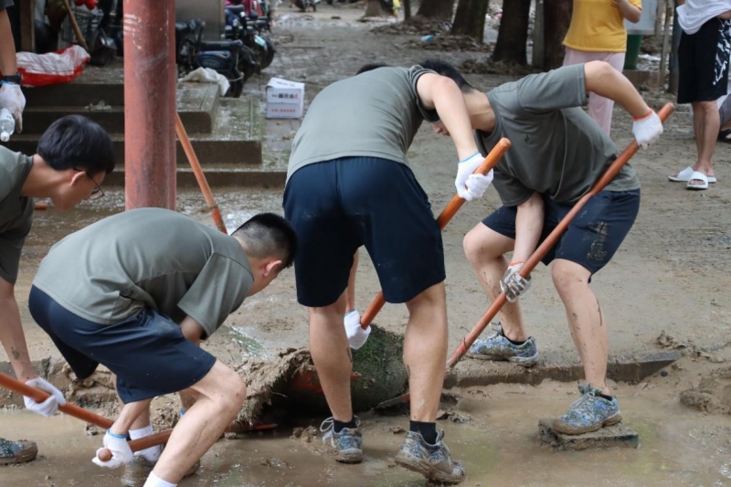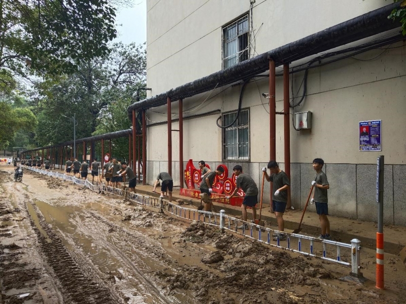 汗水濕透衣背。7月22日上午9時,在河南中醫(yī)藥大學(xué)武裝部、保衛(wèi)處負(fù)責(zé)同志和15名軍訓(xùn)教官的帶領(lǐng)下,85名軍訓(xùn)隊員抵達(dá)東明路校區(qū)。他們根據(jù)現(xiàn)場情況,快速制定抗洪排水方案,進(jìn)行了周密部署,并迅速投入清理道路泥土等抗洪排水工作。校區(qū)內(nèi)道路布滿淤泥、路面大面積被淹,泥漿和著雨水沖出來的垃圾鋪滿路面。同志們不怕臟,不怕苦,士氣高昂,精神抖擻,齊心協(xié)力清淤泥,保暢通。食堂、宿舍樓、道路上,隨處都能看到大家揮灑汗水的身影。3個小時過去了,在大家分秒必爭、全力奮戰(zhàn)下,東明路校區(qū)積水清理完畢,路面煥然一新,各場地整潔干潔,解決了困擾師生的校區(qū)大面積被淹的困境。“軍訓(xùn)官兵、真是好樣的!現(xiàn)在的年輕人,真中!”現(xiàn)場不時發(fā)出感動、贊美聲。
