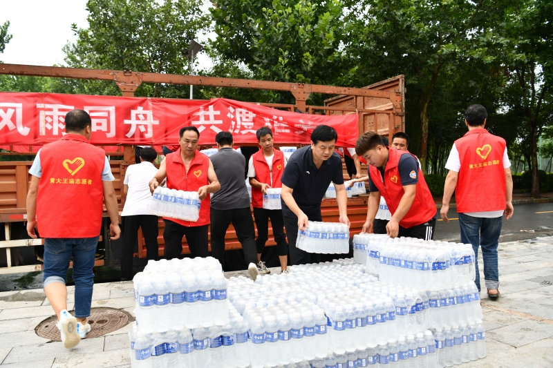 謝乾對黃大王廟村黨支部在防汛搶險的關鍵時期給予學校的愛心捐贈表示感謝,并和志愿者們一道將捐贈物資從貨車上搬卸至學生宿舍。