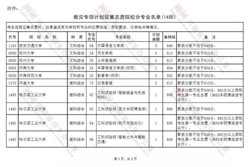 救災(zāi)專項計劃征集志愿院校分專業(yè)名單(14所)