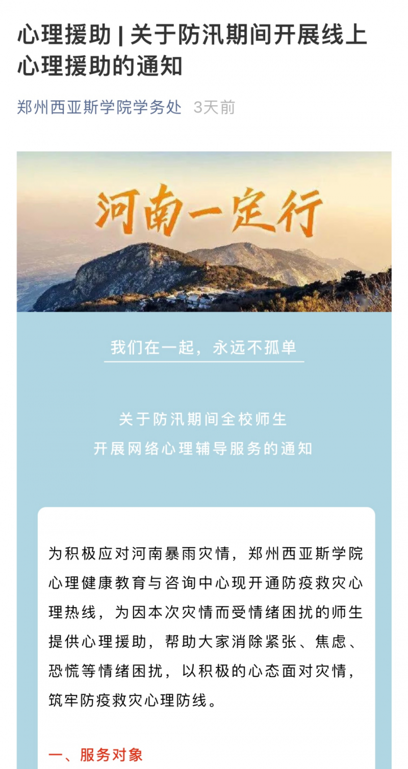 為積極應(yīng)對河南暴雨災(zāi)情,鄭州西亞斯學(xué)院心理健康教育與咨詢中心現(xiàn)開通防疫救災(zāi)心理熱線,為因本次災(zāi)情而受情緒困擾的師生提供心理援助,幫助大家消除緊張、焦慮、恐慌等情緒困擾,以積極的心態(tài)面對災(zāi)情,筑牢防疫救災(zāi)心理防線。