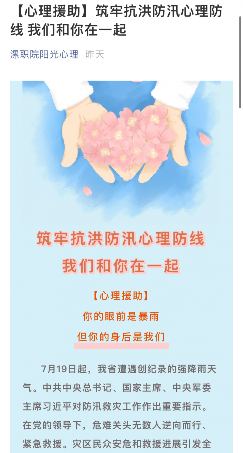 漯河職業(yè)技術(shù)學(xué)院認(rèn)真貫徹習(xí)近平總書記重要指示,深切關(guān)懷身處受災(zāi)區(qū)域的師生,于7月23日起開展心理輔導(dǎo)網(wǎng)絡(luò)咨詢服務(wù)活動,在抗洪防汛期間為廣大師生及社會公眾免費提供網(wǎng)絡(luò)心理輔導(dǎo)服務(wù)。