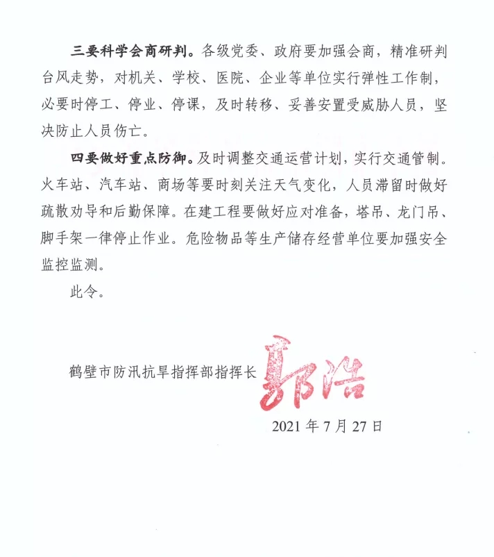 鶴壁市防汛抗旱指揮部發(fā)布指揮長2號令
