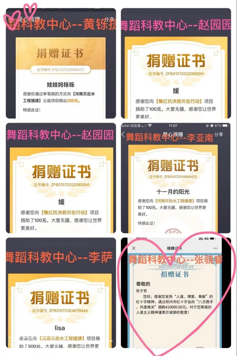 藝體學(xué)部舞蹈科教中心積極發(fā)動(dòng)老師捐款,其中張驍睿老師捐款1萬(wàn)元。附屬醫(yī)院副院長(zhǎng)于春霞向河南省慈善總會(huì)捐款1000元。河南省昊隆實(shí)業(yè)集團(tuán)董事長(zhǎng)、黃河科技學(xué)院書畫藝術(shù)研究院院長(zhǎng)、校友王好君帶領(lǐng)集團(tuán)員工向長(zhǎng)垣市紅十字會(huì)共捐款246300元。醫(yī)學(xué)院校友祁西濤捐贈(zèng)5000元,為災(zāi)區(qū)重建奉獻(xiàn)自己的力量。藝體學(xué)部2010屆畢業(yè)生邵軍,代表“維維股份”河南分公司向母校附屬醫(yī)院和周邊社區(qū)捐贈(zèng)價(jià)值3萬(wàn)余元的產(chǎn)品。2016屆畢業(yè)生董振華代表董欣集團(tuán),為辛苦堅(jiān)守防汛搶險(xiǎn)的一線人員送去了軍用雨衣80套、一次性雨衣500個(gè)、手電筒100支、頭燈30支、雨傘20把、饃片50箱、小面包50箱、火腿腸50箱、牛奶50箱等,表達(dá)了他們的問(wèn)候和與干部群眾“萬(wàn)眾一心,眾志成城”的決心。2007屆畢業(yè)生涂志民、劉成方為受災(zāi)群眾提供生活物品和飲用水,并開通云之聲云救援,傳播救災(zāi)信息。2008屆畢業(yè)生蘆旭帶領(lǐng)家人為受災(zāi)群眾送去生活物資和飲用水。商學(xué)院市場(chǎng)營(yíng)銷專業(yè)學(xué)生李慧玲向新鄉(xiāng)市發(fā)改委赴衛(wèi)輝救援隊(duì)捐贈(zèng)100多個(gè)面包。黨委宣傳部王征同志在新聞上獲知山西救援隊(duì)缺水,在鄭州市大面積停水的情況下,去附近超市購(gòu)買礦泉水送到救援隊(duì)車上。黨委宣傳部趙芳芳同志組織協(xié)調(diào)華中農(nóng)業(yè)大學(xué)校友會(huì)進(jìn)行募捐,并在第一時(shí)間把采購(gòu)到的一批自熱米飯、牛奶、火腿腸、紅牛等食品送到新鄉(xiāng)的搶險(xiǎn)救災(zāi)現(xiàn)場(chǎng),協(xié)調(diào)校友會(huì)聯(lián)系購(gòu)加上廠商捐贈(zèng)共計(jì)十臺(tái)發(fā)電機(jī)送往新鄉(xiāng)輝縣。