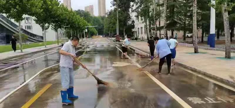 在學(xué)校的統(tǒng)一部署下,各部門職工奮戰(zhàn)在校園各個(gè)角落,為平安校園保駕護(hù)航。后勤集團(tuán)集中力量清理校園環(huán)境,第一時(shí)間排除校園積水,對(duì)校園地面大量泥沙進(jìn)行細(xì)致清理。保證路面清潔的同時(shí),他們還在辦公區(qū)域和教學(xué)樓展開消殺,做好校園內(nèi)防疫工作。餐飲部組織從業(yè)人員對(duì)門店進(jìn)行整理的同時(shí),餐廳和商業(yè)街保持正常運(yùn)行,目前餐廳就餐正常,商業(yè)街物資保障充足。保衛(wèi)處員工全面排查積水點(diǎn),不畏艱險(xiǎn)快速疏通下水道,在積水較深危險(xiǎn)處設(shè)置警示標(biāo)志,將荷花池四周拉起警戒線,有序有效地進(jìn)行排查險(xiǎn)情。他們?cè)诜e水未完全清除前,站在深水中,引導(dǎo)師生和車輛有序通行。全校上下團(tuán)結(jié)一條心,彰顯了黃科院人實(shí)干奉獻(xiàn),頑強(qiáng)拼搏的精神。