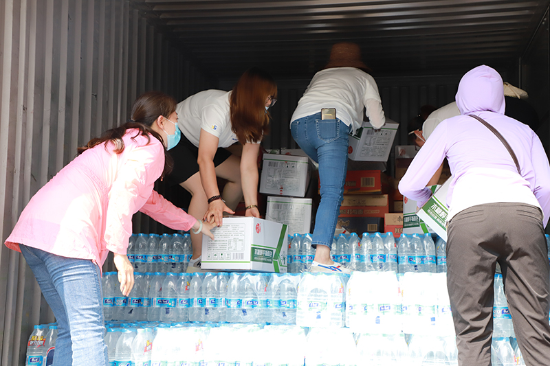 7月25日早上8點(diǎn)不到,陽(yáng)光愛心支援隊(duì)的成員及自愿加入的志愿者就已集結(jié)完畢。他們齊心協(xié)力,將水、面包、方便面等物資搬運(yùn)上車,擺放整齊。