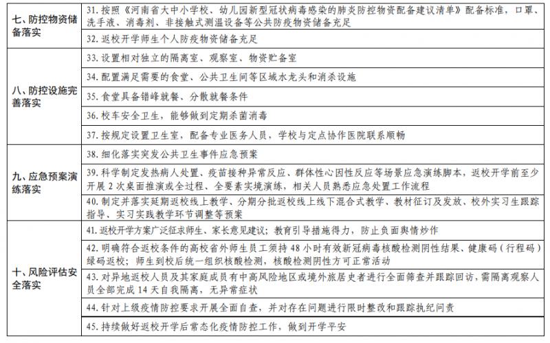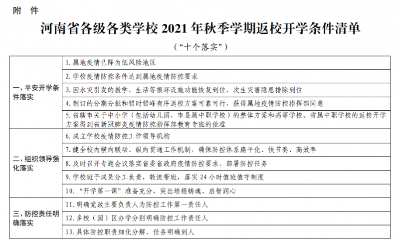 為穩(wěn)妥推動全省各級各類學(xué)校返校開學(xué),確保開學(xué)前后教職工和學(xué)生身體健康、校園安全和教育教學(xué)秩序,堅決做到平安開學(xué)、開學(xué)平安,按照黨中央國務(wù)院疫情防控決策部署以及國務(wù)院應(yīng)對新冠肺炎疫情聯(lián)防聯(lián)控機制綜合組《重點場所重點單位重點人群新冠肺炎疫情常態(tài)化防控相關(guān)防護指南(2021年8月版)》、教育部關(guān)于2021年秋季學(xué)期開學(xué)事宜的相關(guān)要求、教育部科學(xué)謀劃秋季學(xué)期學(xué)生返校開學(xué)三條底線標(biāo)準(zhǔn)和省委省政府新冠肺炎疫情防控工作部署,河南省新冠肺炎疫情防控指揮部教育系統(tǒng)工作專班辦公室研究制定了《河南省各級各類學(xué)校2021年秋季學(xué)期返校開學(xué)條件清單》,一起來看!