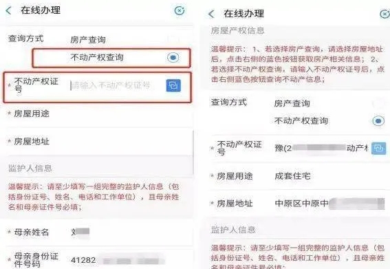 方式二:不動產(chǎn)權(quán)查詢 手動輸入不動產(chǎn)權(quán)證號后,點擊右側(cè)藍色按鈕查詢房產(chǎn)信息(此過程將校驗房屋地址與戶籍是否一致、房屋用途是否符合要求),若查詢無數(shù)據(jù),請確認輸入不動產(chǎn)權(quán)證號是否正確。