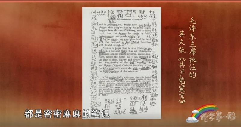 六十多歲的毛澤東主席想學(xué)一些馬克思主義經(jīng)典著作的英文本,他第一本選的也是《共產(chǎn)黨宣言》。閱讀的時(shí)候,毛澤東主席一邊思考一邊做著筆記,從第一頁(yè)到最后一頁(yè),都是他密密麻麻的批注。