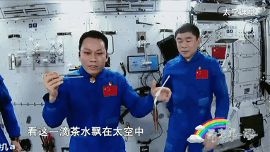 在《開(kāi)學(xué)第一課》的現(xiàn)場(chǎng),航天員湯洪波為我們展示了這一有趣的現(xiàn)象。只見(jiàn)湯洪波手握一雙用繩子連接在一起的筷子,將漂浮在太空艙中狀似果凍的“茶水”夾起,像吃菜一樣吃進(jìn)嘴里。