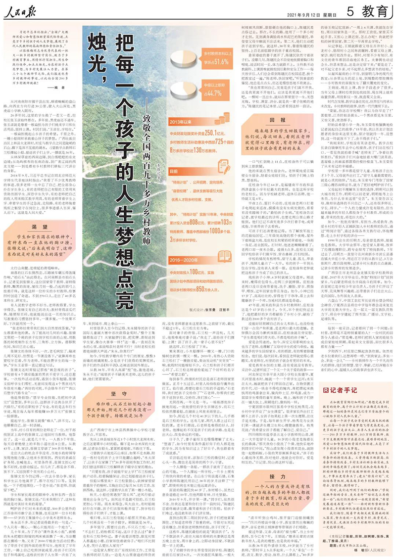 讓每一個孩子充分享受到充滿生機(jī)的教育,讓每一個孩子帶著夢想飛得更高更遠(yuǎn),讓更多的孩子走出大山、共享人生出彩的機(jī)會……290多萬鄉(xiāng)村教師、103萬特崗教師、數(shù)十萬支教教師堅(jiān)守在最邊遠(yuǎn)、最艱苦的地區(qū),用愛心和智慧阻斷貧困代際傳遞,點(diǎn)亮了萬千鄉(xiāng)村孩子的人生夢想。