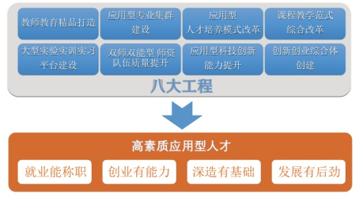 面向現(xiàn)代服務(wù)業(yè)和區(qū)域主導(dǎo)產(chǎn)業(yè),推進(jìn)“教師教育精品打造、應(yīng)用型專業(yè)集群建設(shè)”等八大工程。