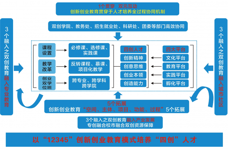 學(xué)校把創(chuàng)新創(chuàng)業(yè)教育貫穿人才培養(yǎng)全過程,踐行學(xué)科專業(yè)、培養(yǎng)方案、課程教學(xué)、實(shí)踐教學(xué)、第二課堂、學(xué)生工作等“六個(gè)站位”創(chuàng)新創(chuàng)業(yè)工作方法,實(shí)施人才培養(yǎng)范式“STEAM”改革實(shí)踐,探索多樣化專創(chuàng)融合模式,涌現(xiàn)出全國(guó)勵(lì)志成長(zhǎng)成才先進(jìn)個(gè)人魏明月等雙創(chuàng)典范。
