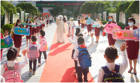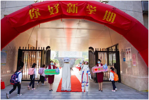 秋日艷艷映藍天,莘莘學子滿校園。學校領導和老師們早早的在校門口等候,組織學生站隊,迎接可愛的孩子們。上午8時,伴隨著歡快的音樂,孩子們邁著輕盈的步伐回到美麗的校園,測溫區(qū)正守護著他們的健康。在學校門口,那可愛親切的“大白”和“宇航員”正笑迎每一個孩子的回歸。久違的上課鈴聲,朗朗的讀書聲,幸福的笑臉,共同匯成一句真誠的問候:你好,新學期!