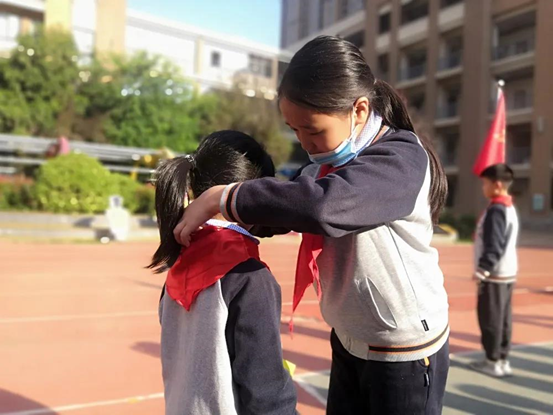活動在激昂的《少先隊出旗曲》中拉開序幕。伴著少先隊員鏗鏘有力的步伐,隊員們高舉右手敬禮注視著中國少年先鋒隊隊旗,齊唱《中國少年先鋒隊隊歌》,用歌聲表達對黨、對祖國、對少先隊組織的熱愛之情。大隊輔導員宣讀了新隊員名單,245名同學正式入隊,老隊員為新隊員送上賀卡,并為他們佩戴紅領巾。少先隊員們在神圣隊旗下鄭重宣誓:“我是中國少年先鋒隊隊員,我在隊旗下宣誓......為共產(chǎn)主義事業(yè)貢獻力量!”石艷君校長向所有新入隊的隊員表示熱烈祝賀,希望孩子們牢記黨的教誨,好好學習,好好鍛煉,全面發(fā)展,茁壯成長,爭做新時代好隊員,為胸前鮮艷的紅領巾增光添彩!