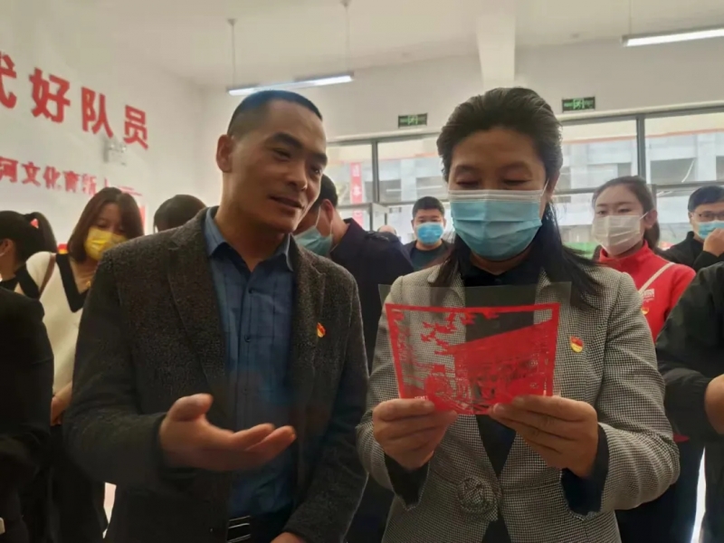 黨建文化墻、紅領(lǐng)巾尋訪打卡地——黃河文化長(zhǎng)廊,一幅幅的圖片和文字,介紹了花園口小學(xué)黨支部以武術(shù)和剪紙為支撐的黃河文化品牌的創(chuàng)建和取得的成就,使與會(huì)人員贊不絕口。學(xué)校書法、泥塑、扎染、剪紙等社團(tuán)作品使人耳目一新,惠濟(jì)區(qū)實(shí)驗(yàn)小學(xué)田鄭敏校長(zhǎng)和惠濟(jì)區(qū)藝術(shù)小學(xué)楊麗梅校長(zhǎng),還和剪紙社團(tuán)學(xué)生現(xiàn)場(chǎng)互動(dòng),更是體驗(yàn)了剪紙的奇妙。
