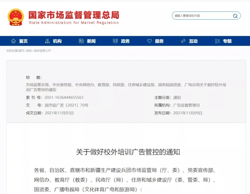 為進(jìn)一步落實(shí)《關(guān)于進(jìn)一步減輕義務(wù)教育階段學(xué)生作業(yè)負(fù)擔(dān)和校外培訓(xùn)負(fù)擔(dān)的意見(jiàn)》有關(guān)要求,近日,市場(chǎng)監(jiān)管總局會(huì)同中宣部、網(wǎng)信辦、教育部、民政部、住建部、國(guó)資委、廣電總局等八部門研究出臺(tái)《關(guān)于做好校外培訓(xùn)廣告管控的通知》,就做好校外培訓(xùn)廣告管控工作作出部署。