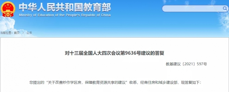 近日,教育部在答復(fù)十三屆全國人大四次會(huì)議第9636號(hào)建議“關(guān)于改善炒作學(xué)區(qū)房,保障教育資源共享的建議”時(shí)表示,“學(xué)區(qū)房”的出現(xiàn)在一定程度上反映了優(yōu)質(zhì)教育資源配置不均衡、校際間辦學(xué)質(zhì)量存在差異的問題。教育部高度重視這一問題,一手推進(jìn)均衡發(fā)展、著力縮小校際差距,一手推進(jìn)多校劃片、治理擇校和規(guī)范招生入學(xué)秩序,取得了明顯成效。