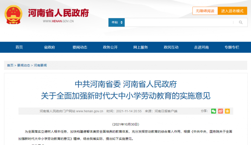 近日,河南省委、省政府出臺《關(guān)于全面加強新時代大中小學(xué)勞動教育的實施意見》。意見規(guī)定,每年五一勞動節(jié)后第一周為全省中小學(xué)勞動教育周,以集體勞動為主;六一兒童節(jié)前后,集中展示中小學(xué)生勞動教育技能和勞動成果;高校可靈活安排勞動教育周或勞動教育月,集中落實各學(xué)年勞動教育要求。