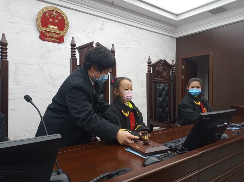 少審?fù)T額法官高果果引領(lǐng)少先隊(duì)員代表參觀了法院的第二審判庭等場所,并介紹了法院的主要工作,講解了法徽、法槌、法袍的含義、作用和審判流程。少先隊(duì)員紛紛走上審判臺(tái),敲響法槌,在審判法庭當(dāng)了一回“小法官”,切身感受司法的公正和法律的威嚴(yán)。