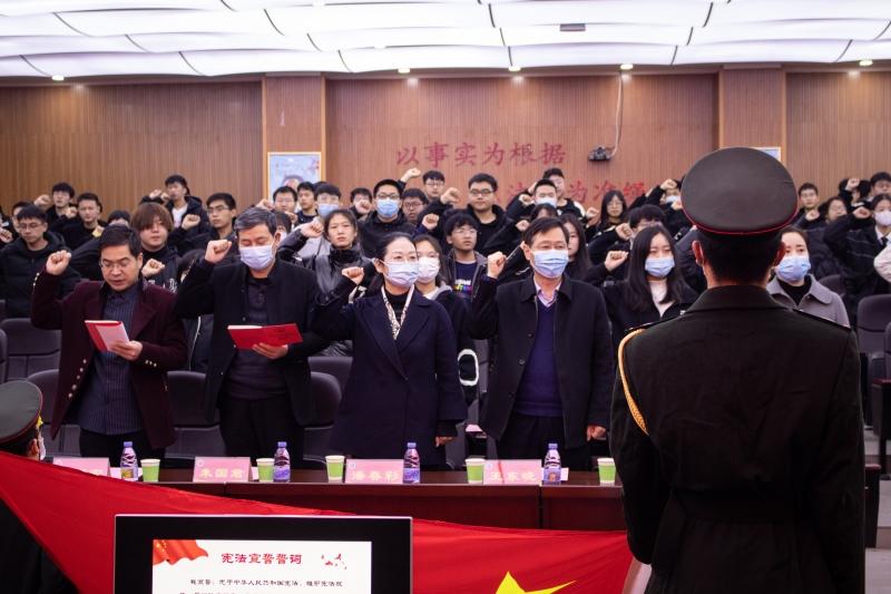 12月3日,許昌學(xué)院在C合二模擬法庭舉行“憲法晨讀”和“憲法宣誓”活動(dòng)。副院長潘春彩、紀(jì)委書記王東曉出席活動(dòng),相關(guān)部門負(fù)責(zé)人、部分專業(yè)教師和學(xué)生代表參加活動(dòng)。與會(huì)人員同北京主會(huì)場一起參加了升國旗儀式,集體誦讀憲法部分條款,并在法學(xué)院黨委書記孟凡根的領(lǐng)誓下,集體向國旗莊嚴(yán)宣誓。