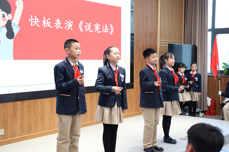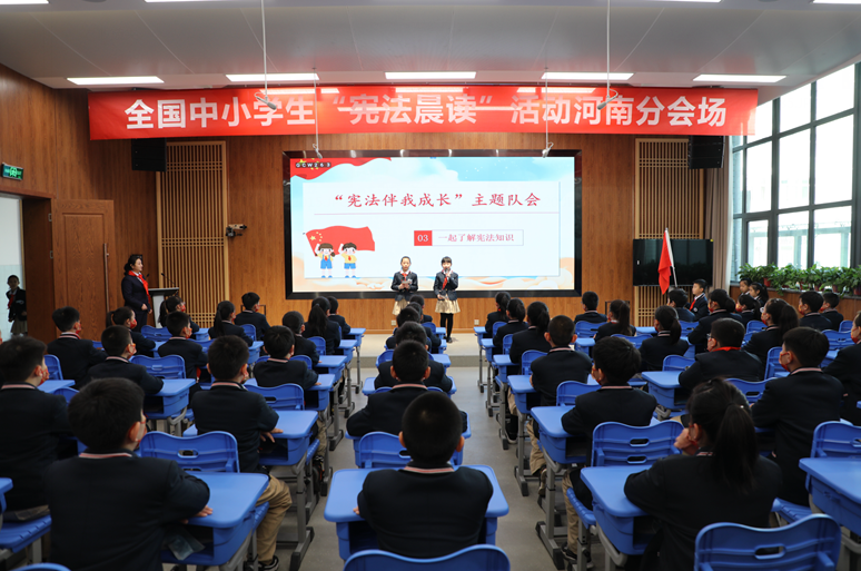 河南分會場上,大家對憲法的學(xué)習(xí)熱情高漲。以河南省實驗小學(xué)四(7)中隊為代表,現(xiàn)場召開了“憲法伴我成長”主題隊會并進行主題演講。通過現(xiàn)場觀看憲法宣傳視頻,中隊成員用生動活潑的快板表演宣傳了憲法的相關(guān)內(nèi)容,并進行憲法知識搶答競賽。