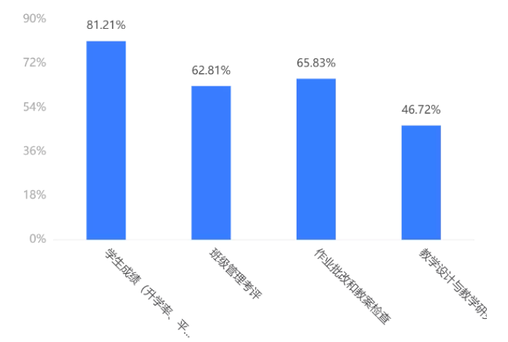 從專業(yè)類方面來看,教師面臨的學生成績(升學率、平均分、優(yōu)秀率等)考評、班級管理考評、作業(yè)批改和教案檢查、教學設計與教學研究考核分別占比為81.21%(多達5403人)、62.81%(多達4179人)、65.83%(多達4380人)、46.72%,根據(jù)數(shù)據(jù)顯示,學業(yè)壓力仍然是教師的最大負擔。