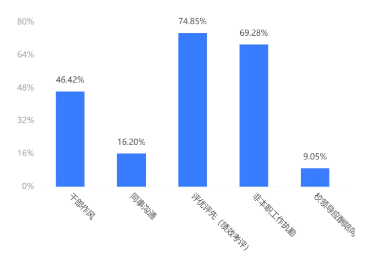 從行政類方面具體來看,教師面臨的干部作風、同事溝通、評優(yōu)評先(績效考評)、非本職工作執(zhí)勤,以及校領導應酬陪同分別占比為46.42%、16.20%、74.85%(多達4980人)、69.28%(多達4609人)、9.05%。由此可見,教師在行政方面的壓力集中于與自己利益密切相關的績效考評及非本職工作執(zhí)勤。