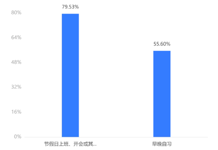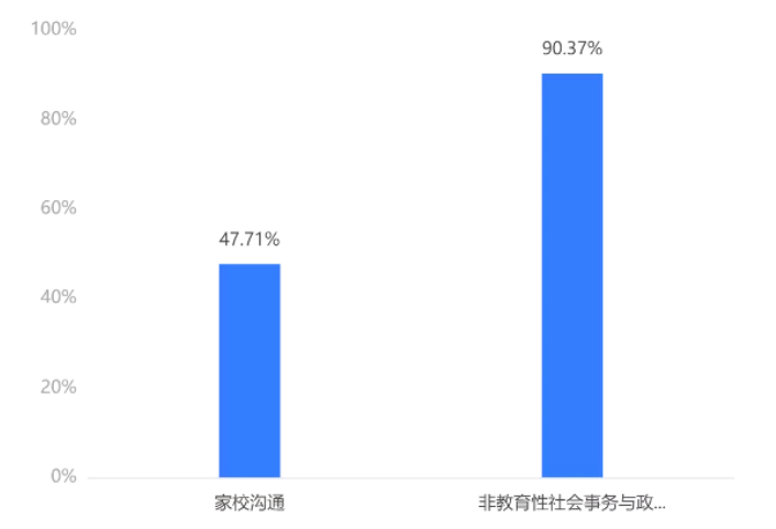 在事業(yè)發(fā)展類負擔中,較之教師的學歷提升與進修,教師的職稱評聘(91.41%,6082人)成為更關注的焦點。而在社會事務類負擔中,教師的非教育性社會事務與政府部門檢查占比為90.37%(多達6012人),明顯高于家校溝通占比(47.71%)。從時間方面來看,教師們的負擔主要來源于節(jié)假日上班、開會或其他組織活動,而非正常教學時間內的早晚自習。