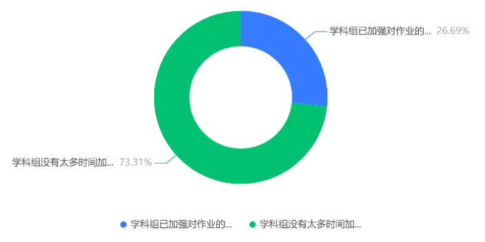 在學生的作業(yè)質量上,學科組已加強對作業(yè)的研究,布置的作業(yè)質量有明顯提升明顯占比為26.69%(有1776人),學科組沒有太多時間加強作業(yè)研究,布置的作業(yè)質量有待提升的占比為73.31%,多達4877人。數(shù)據(jù)顯示,“雙減”政策下學生作業(yè)數(shù)量不但沒有減下來,教師對于作業(yè)研究的時間也相對較少,作業(yè)的質量也還有很大提升空間。