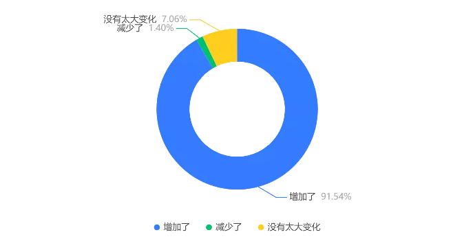 從工作量的角度來看,認為工作量增加的占比為83.93%(5584人),認為工作量未發(fā)生改變的占比12.93%(2860人),認為工作量減少的占比僅為3.14%(209人)。