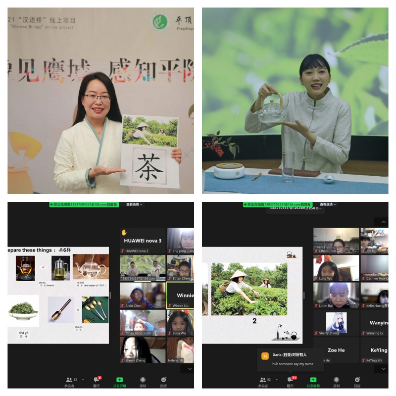 由平頂山學(xué)院左維剛、王盈茜、井怡瓊、李夢(mèng)洋、李曌妍五位教師主講語(yǔ)言直播課,由來(lái)自旅游與規(guī)劃學(xué)院崔霄教師團(tuán)隊(duì)主講茶藝文化直播課。“漢語(yǔ)橋”項(xiàng)目志愿者團(tuán)隊(duì)參與直播互動(dòng)與后臺(tái)導(dǎo)播。為使云端上的美國(guó)學(xué)員充分感受茶文化的美妙意境,授課教師以茶藝為例,詳細(xì)講述了操作六步驟,即行禮、賞茶、投茶、潤(rùn)茶、泡茶和請(qǐng)茶。授課教師向美國(guó)學(xué)員介紹了茶巾、茶杯、茶壺、茶菏、茶匙五種常用的茶具,并從現(xiàn)代科學(xué)的角度引導(dǎo)學(xué)員了解紅茶和綠茶的制作工藝和健康價(jià)值,并指導(dǎo)大家進(jìn)行正確泡茶。直播過(guò)程中,授課教師運(yùn)用豐富的肢體語(yǔ)言,標(biāo)準(zhǔn)的普通話,將中國(guó)茶藝崇尚天人合一的思想融入課程的講解,把濃厚的茶文化信息傳遞給美國(guó)學(xué)員。