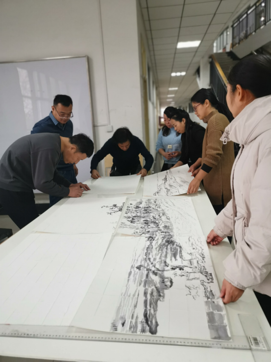 教師團(tuán)隊把課堂搬進(jìn)展廳,帶領(lǐng)學(xué)員現(xiàn)場觀摩、深度學(xué)習(xí),對作品體現(xiàn)的時代面貌、筆墨特征、個人風(fēng)格、區(qū)域文化審美等做了深入解讀,學(xué)員們浸潤在優(yōu)秀的藝術(shù)作品與人文氛圍中,理論學(xué)習(xí)與現(xiàn)場觀摩實(shí)踐緊密結(jié)合、融會貫通,培訓(xùn)取得了良好的成效。受展覽作品的啟發(fā)和鼓舞,全體學(xué)員積極參與,用拼圖式創(chuàng)作方法,用時5個小時,創(chuàng)作出長達(dá)24米的《富春山居圖》,充分展示出了參訓(xùn)教師認(rèn)真學(xué)習(xí)、對藝術(shù)的熱忱和集體的力量。