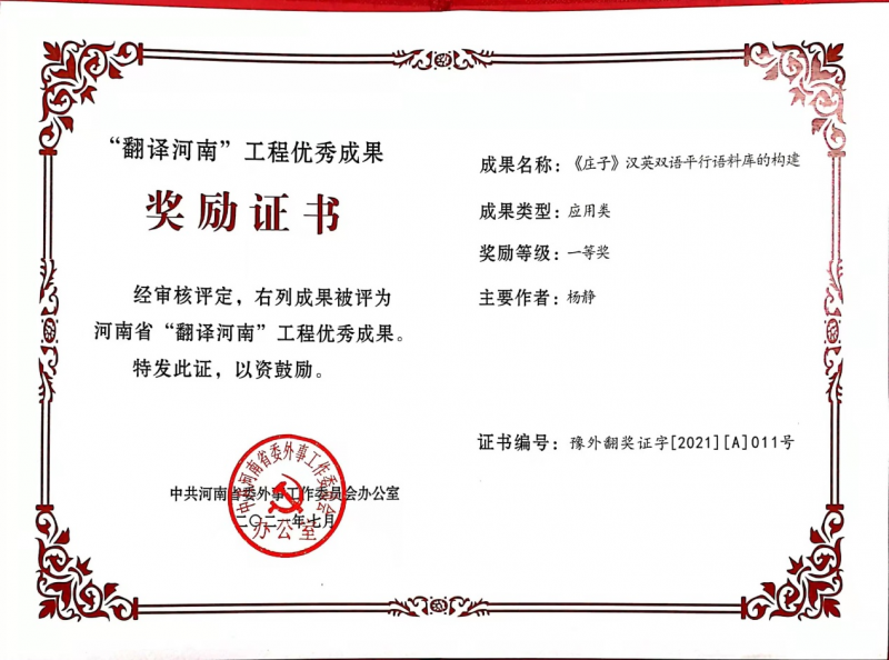 據(jù)悉,2020年3月中共河南省委外事工作委員會與我校外語學(xué)院共建“河南省莊子文化外譯與傳播研究中心”平臺以來,外語學(xué)院持續(xù)加強中心建設(shè),不斷提高教師隊伍的文化研究能力和對外文化傳播水平,提升其國學(xué)翻譯水平和科研論文寫作水平,科研工作不斷取得新成果新突破,以高度的文化自信積極參與我省對外傳播與文化交流,大力推動中原傳統(tǒng)文化走向世界,向世界講好中國故事、河南故事、商師故事。