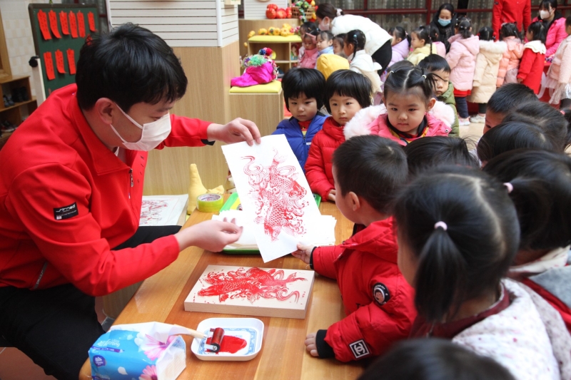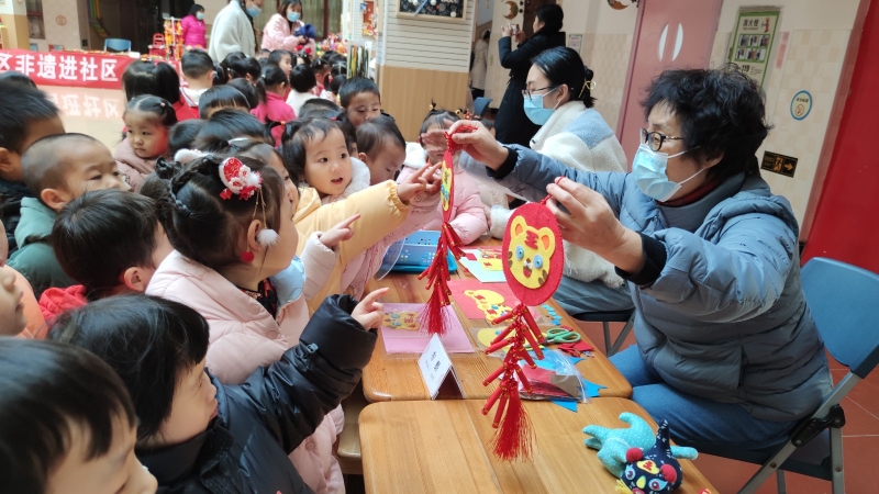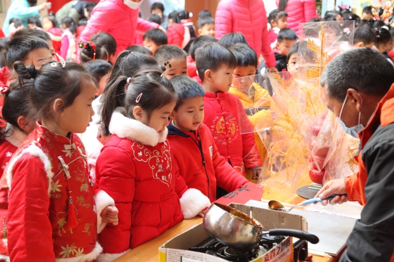 活動(dòng)現(xiàn)場,皮影戲版的唐宮小姐姐來到孩子們身邊,光影與色彩的碰撞讓經(jīng)典劇目《武松打虎》《金色的魚鉤》煥發(fā)新的光彩,老師們操縱皮影人物,繪聲繪色地講述著精彩故事。在一樓中廳的糖畫、剪紙、捏面人、烙畫、紙雕等“非遺”互動(dòng)體驗(yàn)中,孩子們動(dòng)手參與,在做中學(xué)、玩中樂。南操場鑼鼓喧天,威風(fēng)凜凜、氣勢磅礴的舞龍舞獅點(diǎn)燃現(xiàn)場,引得孩子們連連拍手叫好。北操場上,套圈、投壺、扔沙包、騎竹馬、布袋跳……開展形式多樣的民俗游戲,孩子們強(qiáng)健體魄的同時(shí),加強(qiáng)了對(duì)元旦、新年等傳統(tǒng)節(jié)日的認(rèn)知。