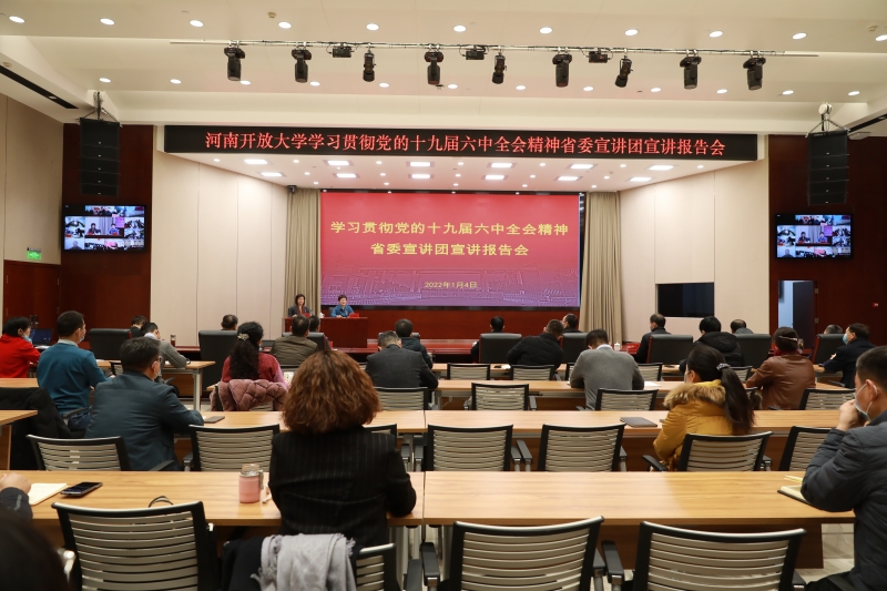 根據(jù)河南省委高校工委、河南省教育廳統(tǒng)一安排部署,1月4日,學(xué)習(xí)貫徹黨的十九屆六中全會精神省委宣講團宣講報告會在河南開放大學(xué)辦公樓二樓會議室舉行。省委宣講團成員、河南職業(yè)技術(shù)學(xué)院黨委書記李桂貞作專題宣講報告。河南省教育廳思想政治工作處處長陳凱、全體校領(lǐng)導(dǎo)出席報告會,學(xué)校各部門主要負責(zé)人、馬克思主義學(xué)院全體教師現(xiàn)場聆聽宣講報告,全省電大系統(tǒng)以網(wǎng)絡(luò)視頻形式參會學(xué)習(xí)。報告會由河南開放大學(xué)黨委書記、校長趙繼紅主持。