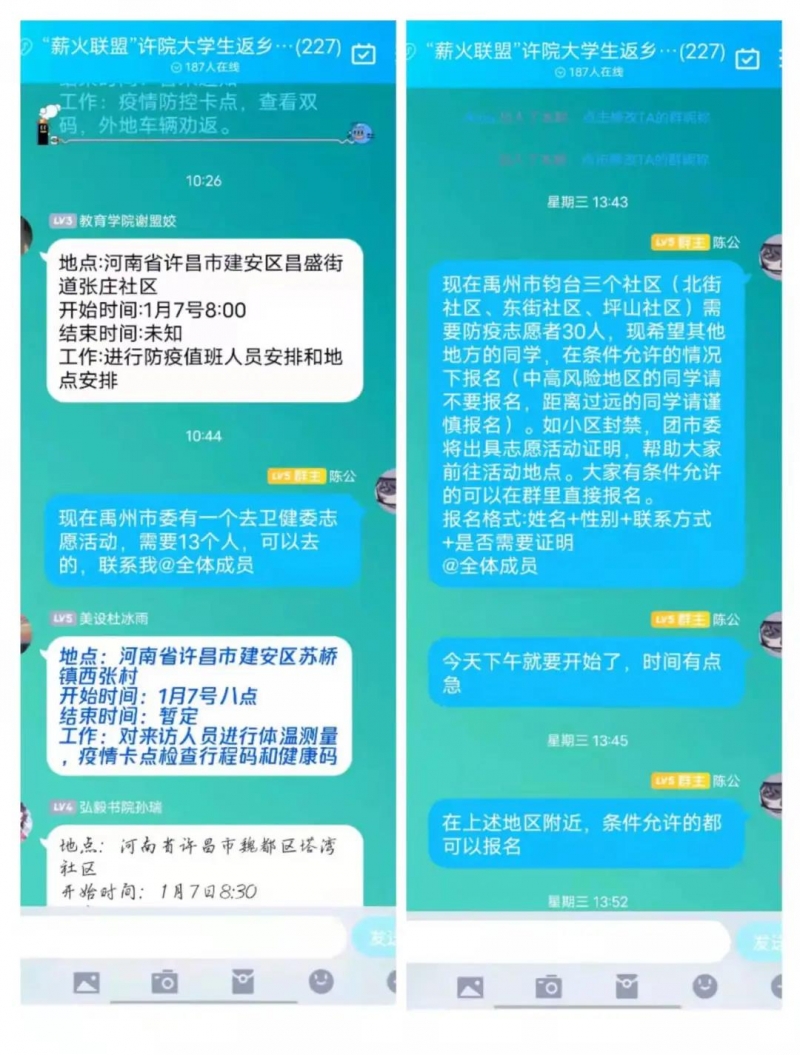 與此同時,來自許昌學院的兩支青年志愿者隊伍通過網絡迅速集結,幾百名禹州籍大學生聞令而動,扛起責任投身抗疫一線,在當?shù)匾咔榉揽刂胸暙I出青春力量。