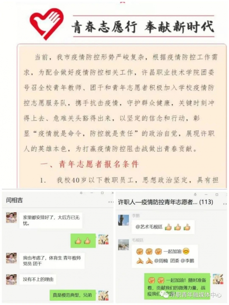 黨有號召,團(tuán)有行動(dòng),面對異常嚴(yán)峻的疫情形勢,校團(tuán)委結(jié)合實(shí)際,多管齊下,引導(dǎo)廣大學(xué)生正確認(rèn)識疫情,堅(jiān)定防控信心,自覺遵守防疫措施,并向各級團(tuán)組織和全體團(tuán)員青年發(fā)出積極參與疫情防控動(dòng)員令,要求團(tuán)干部、團(tuán)員青年帶頭擔(dān)當(dāng)作為,帶頭執(zhí)行防控紀(jì)律,帶頭做好動(dòng)員,當(dāng)“許職人——疫情防控青年志愿者”的招募公告在公眾號平臺發(fā)布后,全校師生紛紛響應(yīng),戰(zhàn)“疫”先鋒隊(duì)迅速集結(jié),一天內(nèi)就有113名師生主動(dòng)加入,用行動(dòng)彰顯許職人責(zé)任和擔(dān)當(dāng)。