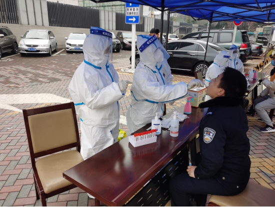 到達(dá)任務(wù)點(diǎn)后,采集工作有條不紊地進(jìn)行,但很快采集咽拭子的手就凍得僵硬,嚴(yán)格消毒的手套更是冰上加冰,雙腳也只有靠來(lái)回踱步取暖,而當(dāng)抬頭看到公安局墻上里“對(duì)黨忠誠(chéng),服務(wù)人民”的標(biāo)語(yǔ)時(shí),持續(xù)的暖流,滿滿的能量涌向她的全身。
