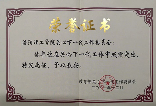2021年12月,國(guó)家教育部通報(bào)表揚(yáng)全國(guó)教育系統(tǒng)關(guān)心下一代先進(jìn)集體、先進(jìn)工作者和突出貢獻(xiàn)獎(jiǎng),洛陽理工學(xué)院關(guān)工委獲得全國(guó)教育系統(tǒng)關(guān)心下一代工作先進(jìn)集體。這是洛陽理工學(xué)院關(guān)工委繼2021年1月獲得全國(guó)高校“讀懂中國(guó)”活動(dòng)優(yōu)秀組織獎(jiǎng)之后,再次獲得全國(guó)性榮譽(yù)獎(jiǎng)勵(lì)。作為一所新建本科高校,洛陽理工學(xué)院關(guān)工委緣何接連獲得“國(guó)字號(hào)”獎(jiǎng)勵(lì)?