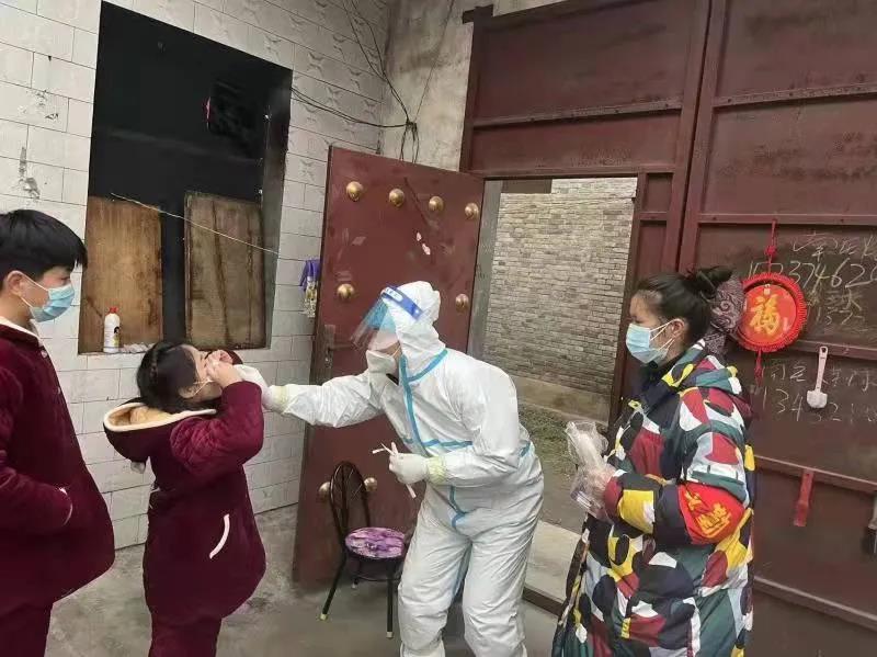 “出彩河南人”2021最美教師王變變(右一)協(xié)助醫(yī)護(hù)人員走村入戶進(jìn)行核酸檢測
