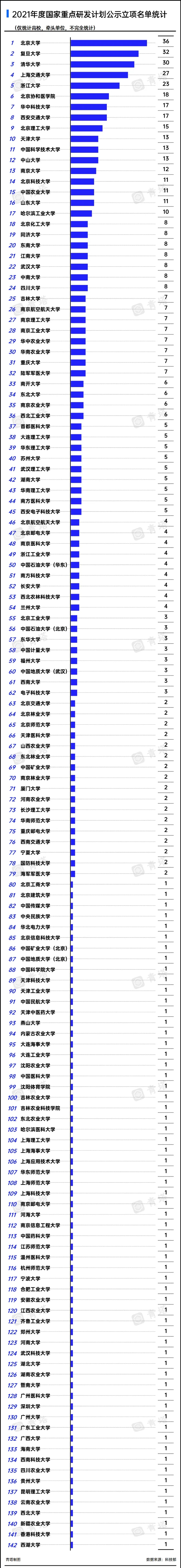 2021年公示的國家重點研發(fā)項目高校部分統(tǒng)計如下:
