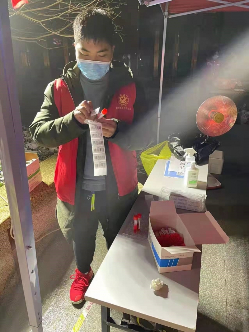 張政,20級(jí)高職計(jì)算機(jī)1班團(tuán)支書,入黨積極分子。“疫情就是命令,防疫就是責(zé)任”,1月5日上午接到新鄭市新華路辦事處裴大戶寨社區(qū)全員核酸檢測(cè)工作的通知。因?yàn)?021年暑假參加過(guò)志愿服務(wù),有居民錄入信息系統(tǒng)培訓(xùn)的經(jīng)歷,于是在此次志愿活動(dòng)中他成為了一名專職信息采集員,當(dāng)天晚上7點(diǎn)開(kāi)始支帳篷抬桌子,僅用半個(gè)小時(shí)就搭起了臨時(shí)核酸檢測(cè)的帳篷,在寒冬臘月里,盡管天氣很嚴(yán)寒,但內(nèi)心是火熱的,積極組織好核酸檢測(cè)成員掃碼預(yù)約,安全距離排隊(duì),做好人員登記等,連續(xù)6個(gè)小時(shí)多的工作,等他“下班”了,手腳都凍僵了。從1月5號(hào)到1月9號(hào)新鄭市連續(xù)做了4輪全員核酸,作為志愿者的他也開(kāi)啟了“白+黑”的戰(zhàn)斗模式,每天早上四點(diǎn)半就要起床趕往監(jiān)測(cè)點(diǎn),他的父親也是一名采集員,但父子兩個(gè)并沒(méi)有分到一個(gè)檢測(cè)點(diǎn),倆人在微信里互相鼓勵(lì)、加油。他說(shuō):在這場(chǎng)沒(méi)有硝煙的戰(zhàn)爭(zhēng)中,作為青年大學(xué)生責(zé)無(wú)旁貸,更當(dāng)前行,這是時(shí)代賦予我們的光榮使命。