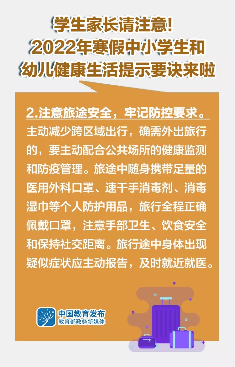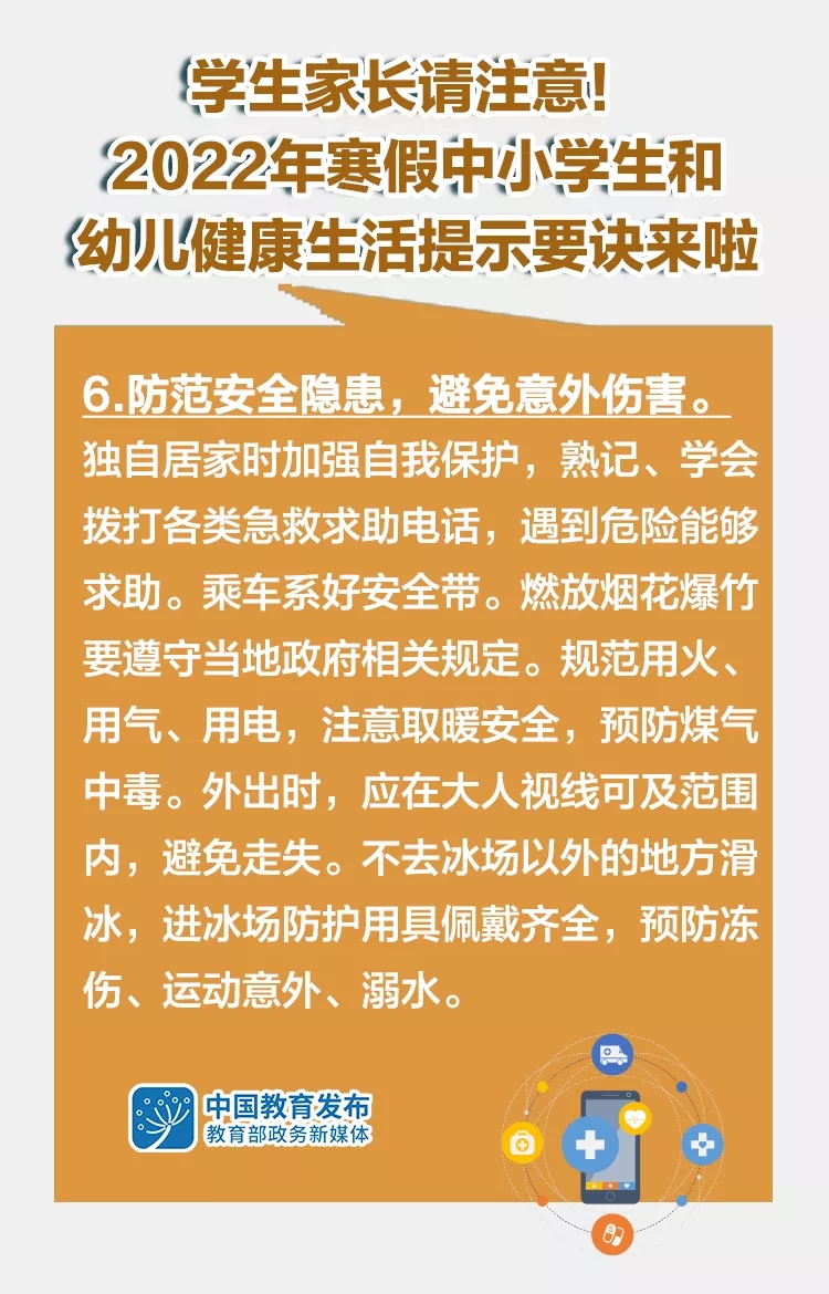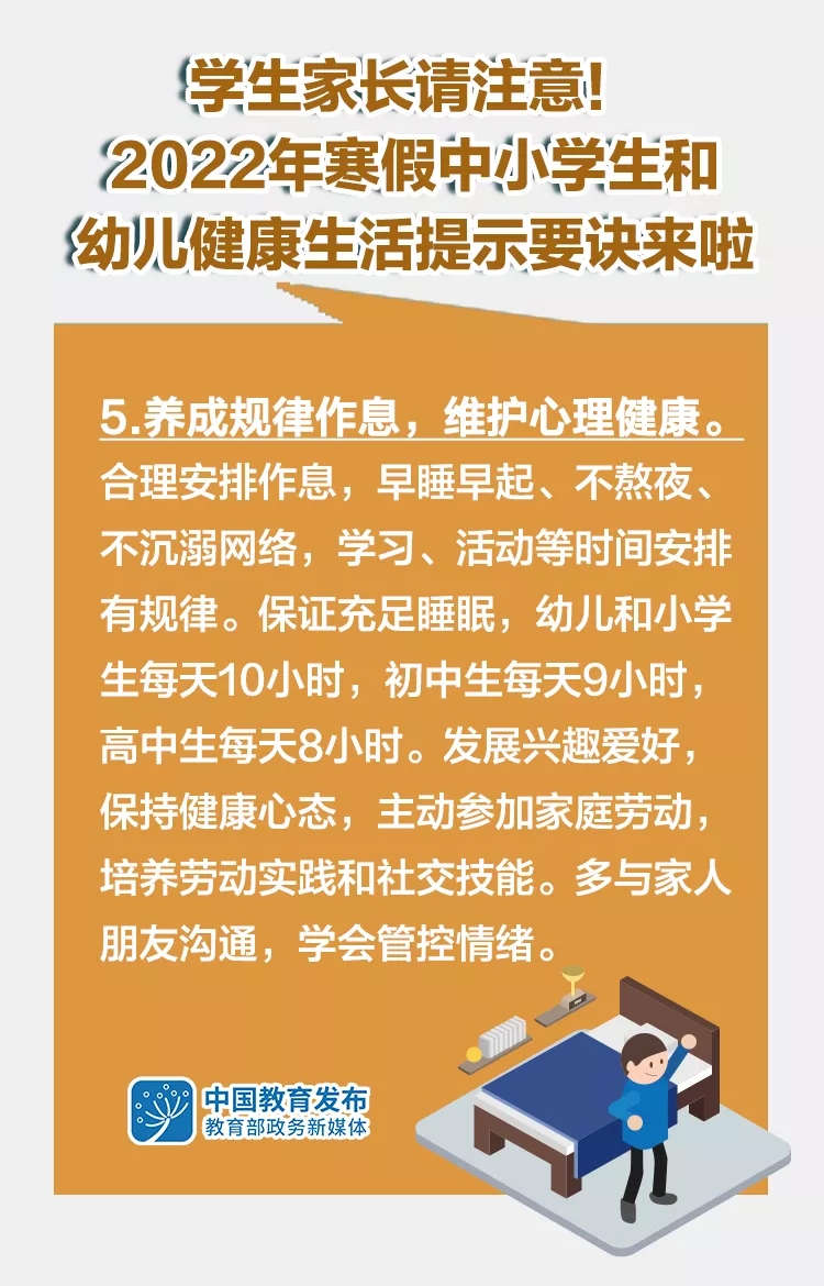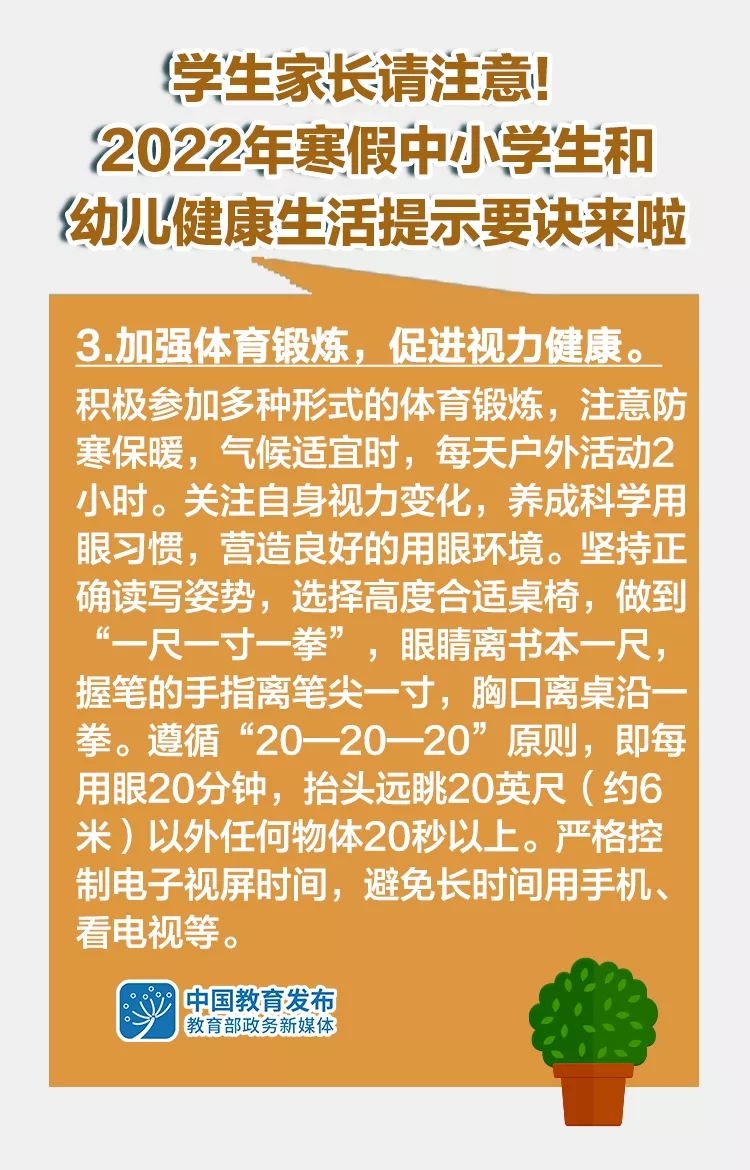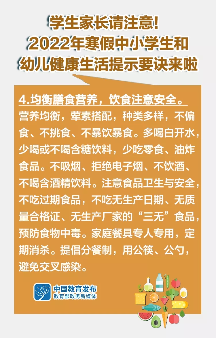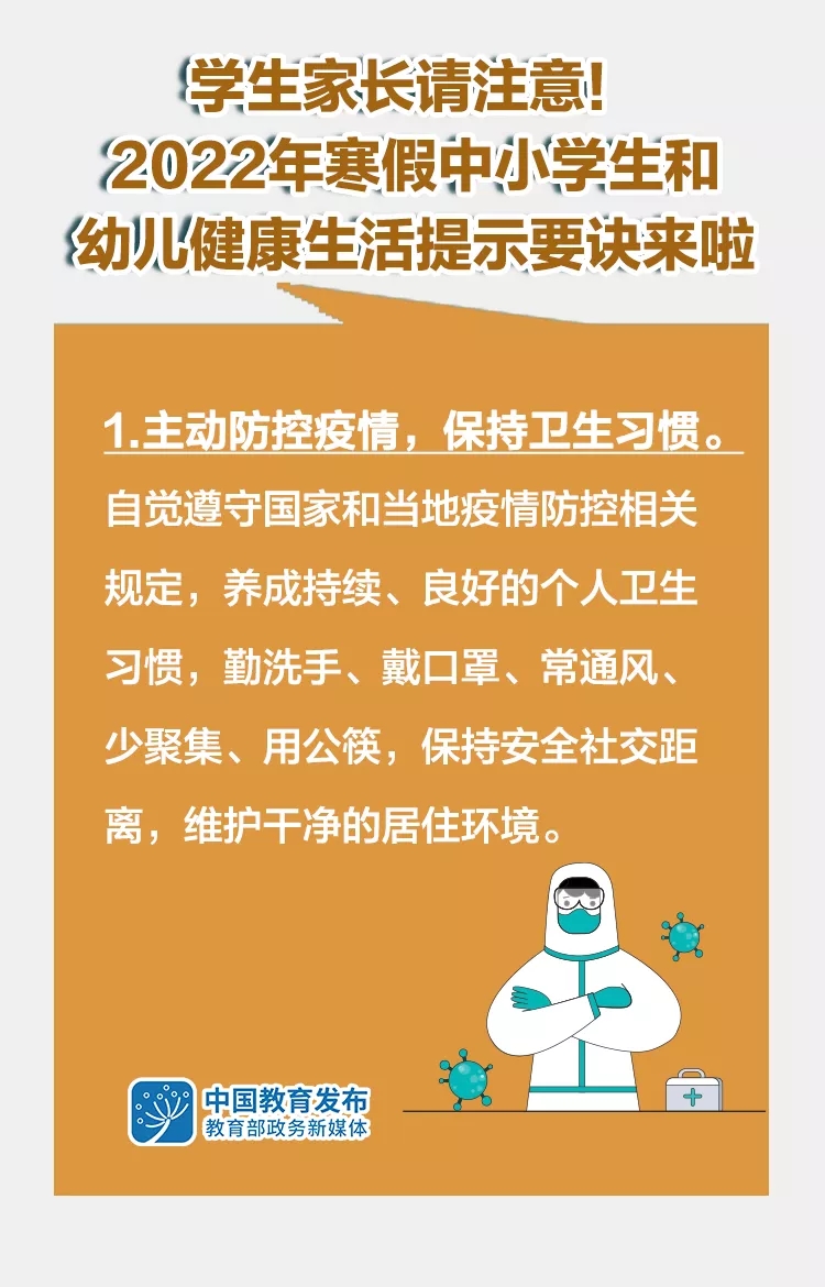 近日,教育部指導全國中小學健康教育教學指導委員會專家,提出2022年寒假中小學生和幼兒健康生活提示要訣,引導中小學生和幼兒加強體育鍛煉,合理安排假期生活和學習,均衡膳食營養(yǎng),養(yǎng)成健康生活方式,做自己健康的第一責任人。一起來看這組大圖——