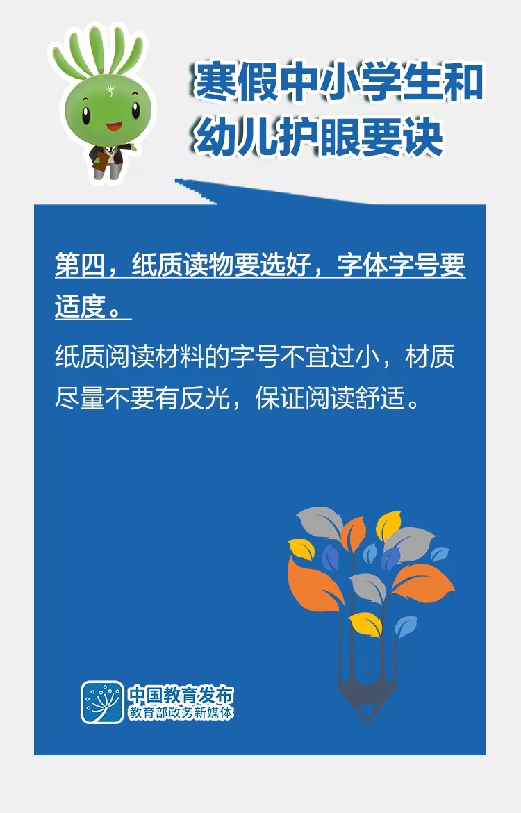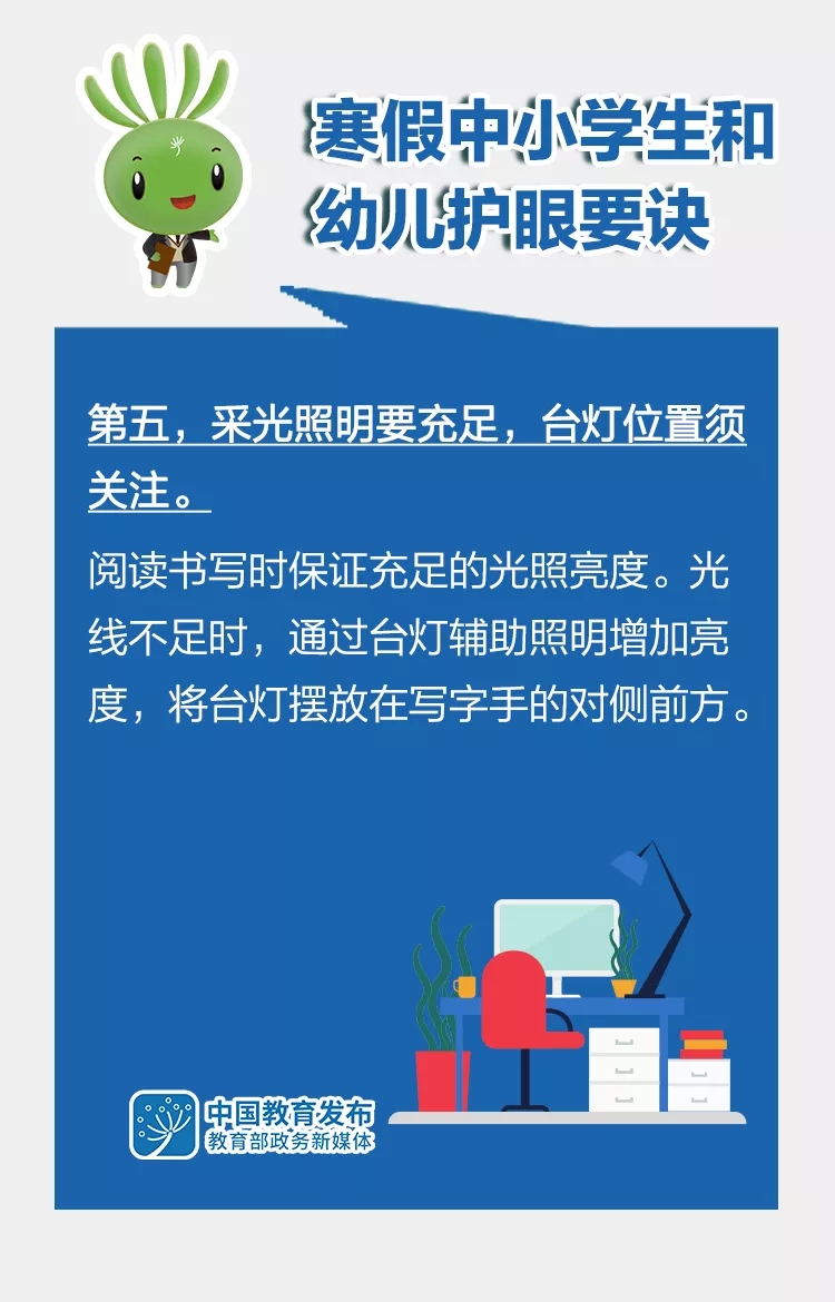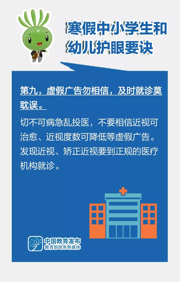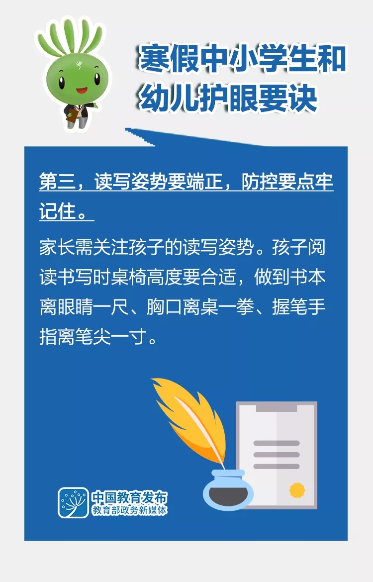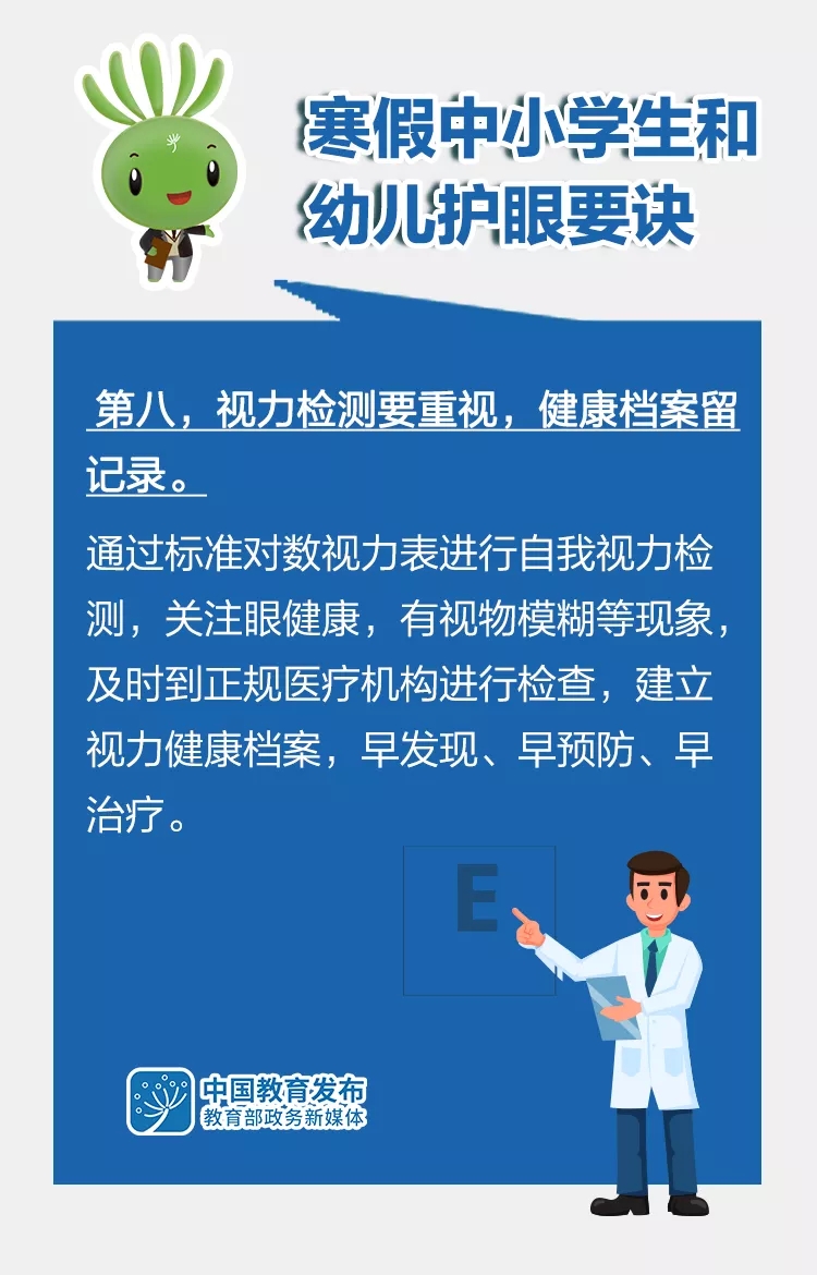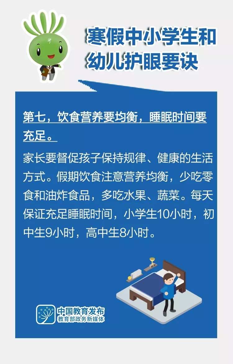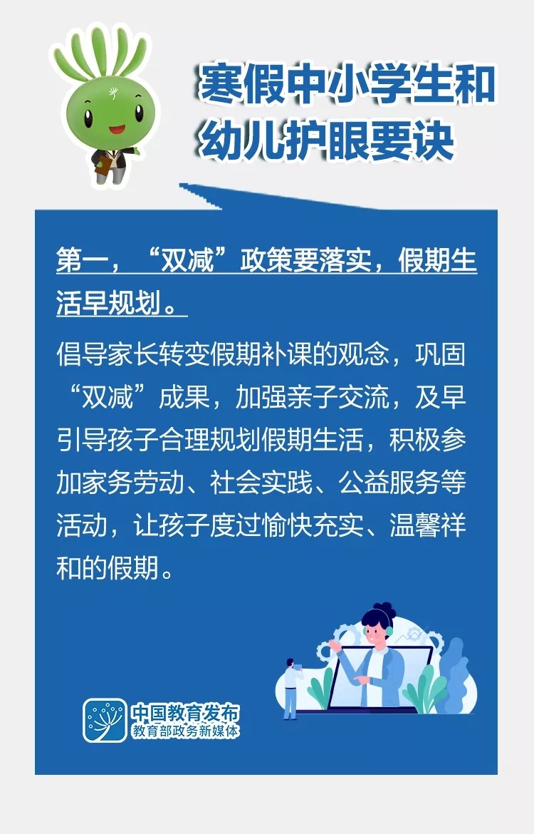 “雙減”后的第一個寒假即將來臨,為了讓孩子們過一個健康快樂的假期,教育部指導全國綜合防控兒童青少年近視專家宣講團,在已有版本基礎上,修訂形成《2022年寒假中小學生和幼兒護眼要訣》,倡導廣大中小學生和幼兒假期科學合理安排好生活、學習,科學健康護眼,積極主動防控近視。一起來看這組大圖——
