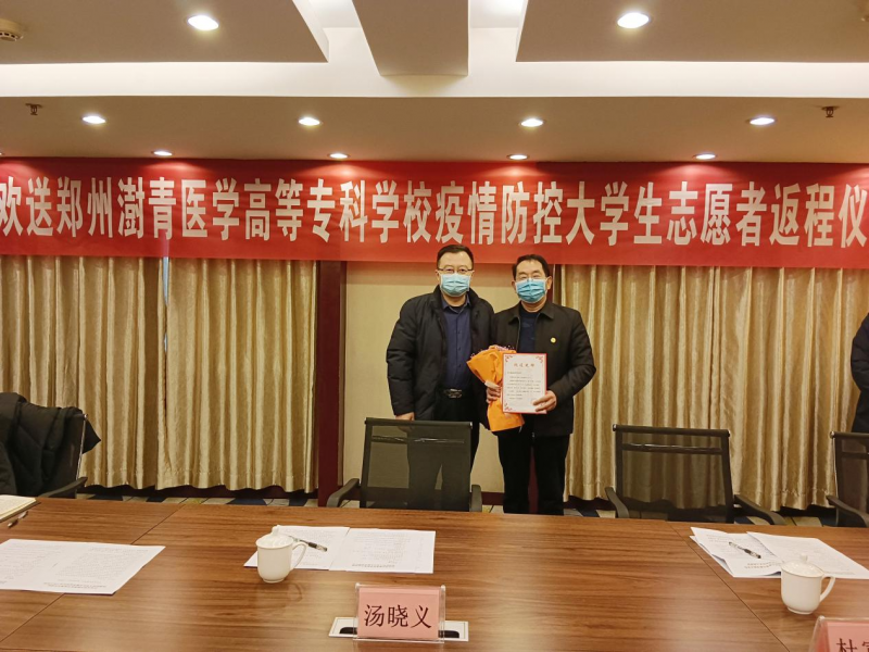 湯曉義滿懷真摯地向鄭州澍青醫(yī)專及所有大學生志愿者們致謝。他表示,歷史和現實無數次證明,青年有擔當是國家前途所在、民族希望所系。鄭州澍青醫(yī)專大學生志愿者的支援為二七區(qū)疫情防控轉運工作帶來了及時雨、雪中炭。從志愿者身上,看到了當代大學生的社會責任感、使命感,詮釋了當代青年的責任擔當,展現了學校“醫(yī)者仁心”的良好精神風貌!“感謝鄭州澍青醫(yī)專的培養(yǎng)和支持!祝愿志愿者們順利返程、平安健康!”歡送儀式在湯曉義的殷切囑咐聲中圓滿結束。